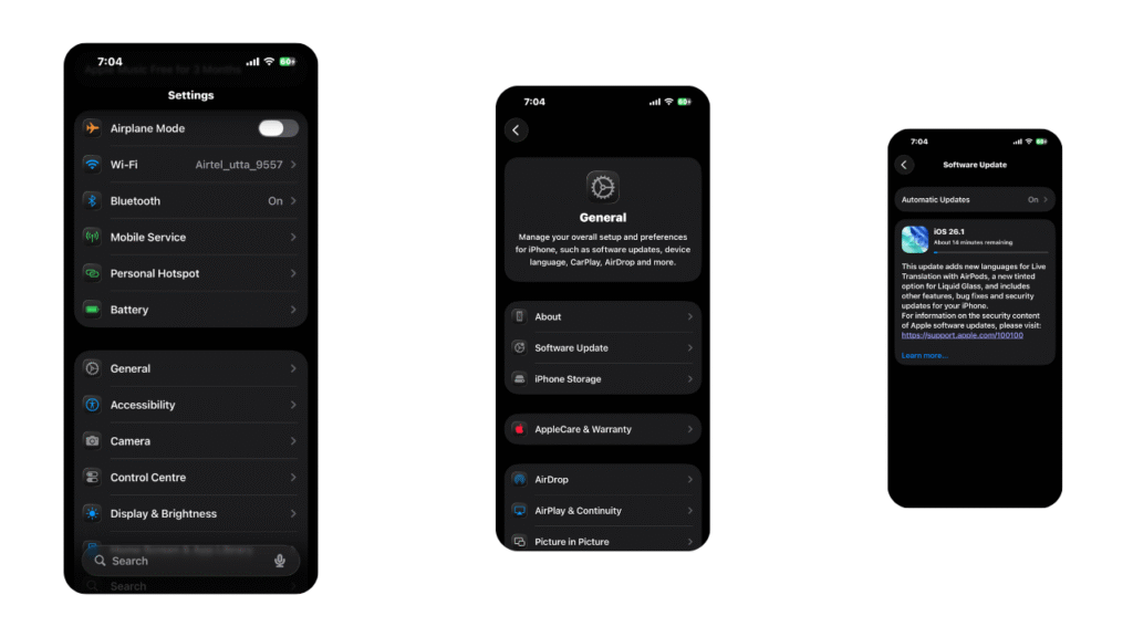 - ग्राफिक्स स्टटरिंग: कुछ आईफोन 16/17 मॉडल्स पर ऐप्स खोलते समय हल्का लग या ग्राफिक्स में झटका। कारण: नए डिज़ाइन के कारण प्रोसेसिंग लोड। समाधान: रीस्टार्ट या iOS 26.1.1 का इंतजार—जो जल्द आ सकता है।