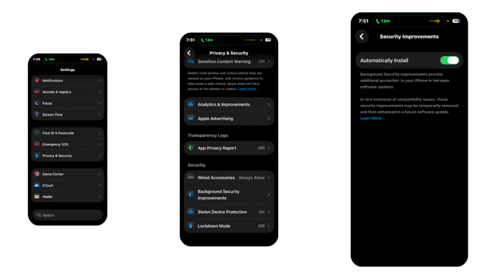 - बैकग्राउंड सिक्योरिटी इम्प्रूवमेंट्स: पुराने ‘रैपिड सिक्योरिटी रिस्पॉन्स’ का नया रूप। सेटिंग्स > प्राइवेसी एंड सिक्योरिटी में ऑटो-इंस्टॉल ऑन करें। फायदा: पूर्ण अपडेट के बिना सिक्योरिटी पैच मिलते रहें, बिना रुकावट के।